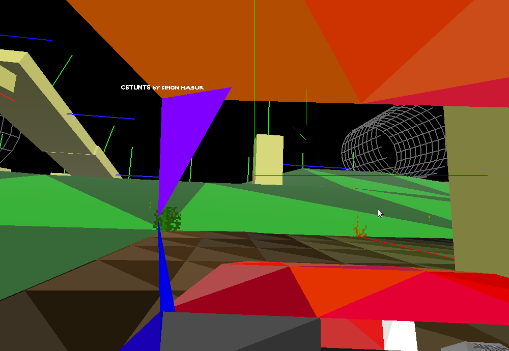 Updated 2023-10-14 CSTUNTS - realistic off-road driving simulation About the author On his site, the author of this game, whose name is Simon Hasur, wrote After having clamorously failed in everything I've ever tried, together with a disastrous school career, I came to the programming of simulators, initially in Matlab, then in C and then in C++ . I started by making some 2D, then 3D driving simulators, and so familiarized a bit with the 3D rigid-body dynamics: with and without constraints, to simulate either single independent, or articulated bodies. Besides dynamical simulations, he also programmed some terrain rendering algorithmsThe original version of this game is available at sourceforge.net, along with other programs made by the same author. About free software If you acquire a computer program accompanied by a licence that doesn't allow you to give copies of the program to others, this means you will be required to have an antisocial unwilling or unable to associate in a normal or friendly way with other people