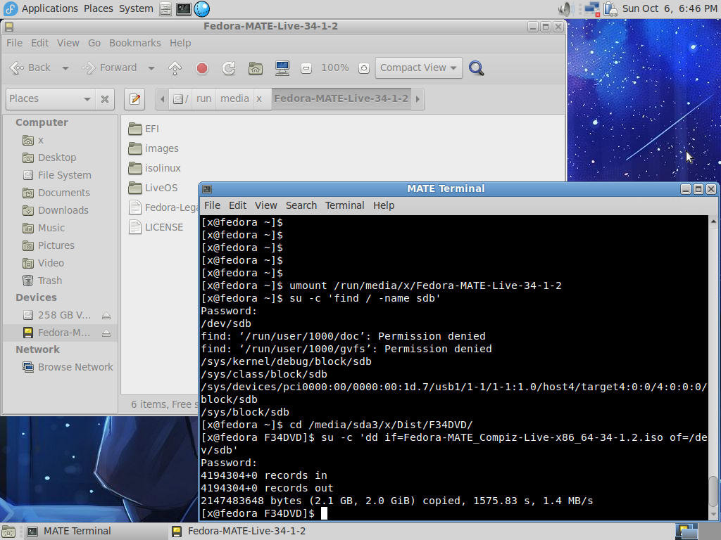 su -c 'dd if=Fedora-MATE_Compiz-Live-x86_64-34-1.2.iso of=/dev/sdb'