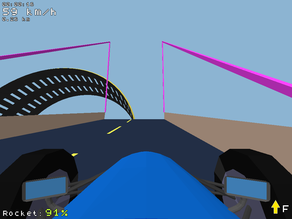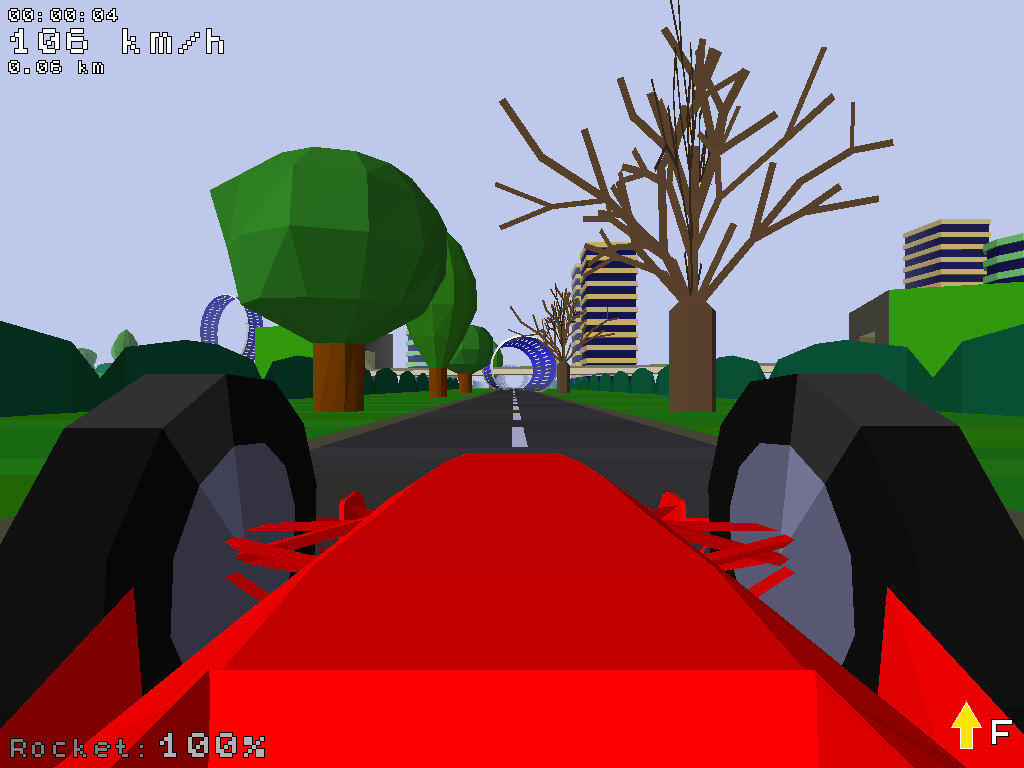 However, the graphics were 3D and colourful, so they inspired me to make a program for rendering 3D models, which eventually led to the development of the game presented here. Versions 1.0.0 - 4.1.0 1.0.0 (2010-01-02) First version. The track is entirely horizontal and the simulation is very simple. I hadn't yet figured out how to make 3D coordinate transformations, so here the entire track is just translated and rotated horizontally at every time step according to the control inputs. The position of the camera (X = Y = Z = 0.0) can't be changed, obviously. I actually knew the mathematical relations for the 3D transformations from school, but they were taught in an algebra class, not geometry, so it took me a while to figure out what they were for. MD5: d314d9f8577c69ae7d0f09557edba633