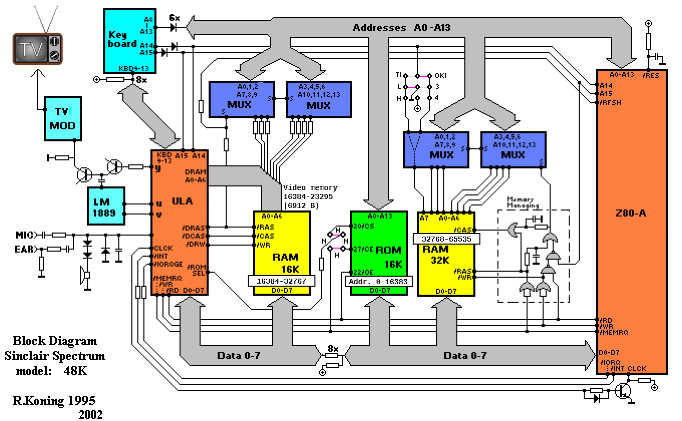 In the ZX Spectrum's memory, each address stores 8 bits (1 byte) and the Z80 CPU can handle an address size of 16 bits, so 216 = 65536 B = 64 KiB of memory can be accessed directly by the CPU. The model with 48 KiB of RAM has 64 KiB of memory in total, of which the first 16 KiB (addresses 0—16383) are read-only memory (ROM), storing a BASIC Sinclair BASIC was originally developed in 1979 for the ZX80 by Nine Tiles. The programmers